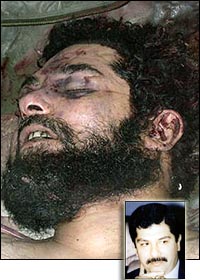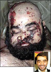 而烏代的遺容可謂慘不忍睹:眼臉因?yàn)橛傺@得浮腫并呈絳紫色,一條深褐色的傷口從其左眼一直貫穿到嘴巴右下角,光禿禿的腦門上傷痕累累,可能是被導(dǎo)彈的碎片劃傷的。最為顯然的是其前額右上方一個(gè)汩汩地向外噴涌著鮮血的彈孔,他究竟是被美軍開槍打中的,還是自殺身亡依然是個(gè)謎。