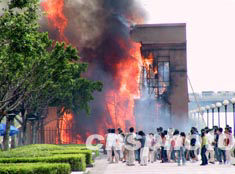 一個風和日麗的日子里,M國駐廣州領(lǐng)事館門前人們在悠閑地交談、漫步,突然,轟隆一聲巨響,只見領(lǐng)事館窗口濃煙滾滾,頃刻大火蔓延,驚慌的人們四散逃開,哭聲、喊聲、呼救聲夾雜一片,一些民眾則被困在領(lǐng)事館的天臺顯得非常無助……
