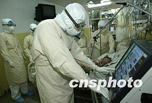 北京一名病程達(dá)89天、年近六旬的男性SARS患者,7月26日中午經(jīng)北京市首席SARS醫(yī)療專家王辰(前)等搶救無效死亡。目前,北京尚有12名住院SARS患者,經(jīng)專家組近日會(huì)診,絕大多數(shù)患者的SARS病癥已經(jīng)痊愈,沒有傳染性,困擾他們的是其他基礎(chǔ)病。中新社記者:任晨鳴