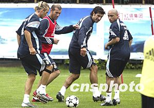 據(jù)新聞晨報(bào)消息,在主力組中,貝克漢姆的位置是右前衛(wèi),原本打這個(gè)位置的另一名巨星菲戈被放在左前衛(wèi)的位置上。既然皇馬已經(jīng)開始試驗(yàn)這樣的中場(chǎng)組合,那么小貝很有希望在8月2日和龍之隊(duì)的比賽中作為主力亮相工體。