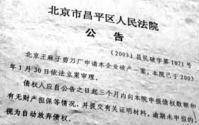 王麻子剪刀廠申請破產(chǎn)后,按照相關(guān)法律程序,法院在立案后,將有3個月的公告期,最終依法宣告破產(chǎn)。在破產(chǎn)清算后,用剩余資產(chǎn)安置職工、還貸、還債。宣告破產(chǎn)后,“王麻子”可以甩掉多大的經(jīng)濟(jì)包袱,廠方?jīng)]有明確的答復(fù),但他們認(rèn)為更重要的是多年來“剪不斷理還亂”的歷史問題該有個說法。(據(jù)《每日新報》)