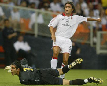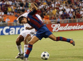 雙方在上半場比賽中主力盡遣,巴塞羅那排出了451陣容,薩維奧拉突前,巴塞羅那剛剛加盟的羅納爾迪尼奧以主力身份出現(xiàn)在首發(fā)陣容中。AC米蘭則以他們慣用的442應(yīng)敵,舍甫琴科和因扎吉在鋒線上搭檔。
