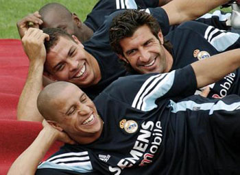 夏日的昆明,訓(xùn)練間隙,皇家馬德里隊(duì)的三大巨星羅納爾多、齊達(dá)內(nèi)和卡洛斯愜意的躺在訓(xùn)練場上,享受著“春城假日”。