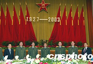 中國(guó)國(guó)防部三十一日在北京舉行招待會(huì),慶祝中國(guó)人民解放軍建軍七十六周年。中央軍委副主席曹剛川(中)、中央軍委委員廖錫龍(左二)、徐才厚(左三)、梁光烈(右三)、李繼耐(右二)出席招待會(huì)。中新社記者:鄭萍萍