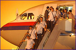 據(jù)悉,雖然皇馬一行要凌晨0時(shí)35分才能飛抵北京,但在昨晚10時(shí)15分,就已經(jīng)有上百球迷在首都機(jī)場苦苦等候了。而在飛機(jī)安全降落后,上百名安保人員立即擋住現(xiàn)場大約300多人的球迷、記者,勞爾第一個(gè)走下飛機(jī),貝克漢姆則是第六個(gè),在皇馬球星全下飛機(jī)后,安保人員保護(hù)球員從南停機(jī)坪西門走出。