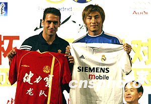 西班牙皇家馬德里足球隊(duì)與中國健力寶龍隊(duì)八月一日在北京飯店舉行賽前新聞發(fā)布會,皇馬隊(duì)長勞爾與龍隊(duì)隊(duì)長李瑋峰在會上互贈隊(duì)服。中新社記者:毛建軍