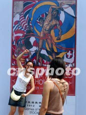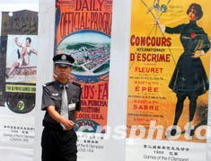 歷屆奧運(yùn)會會徽宣傳畫八月三日列陣北京天壇祈年殿前的昔日皇家神路兩旁,迎候神秘的北京2008年奧運(yùn)會會徽當(dāng)晚夜幕降臨時(shí)在此大白于天下。中新社記者:賈國榮