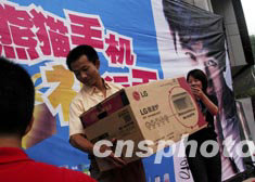 面對外國手機雄霸中國大城市的現(xiàn)狀,一些國產(chǎn)手機避開峰頭選擇在中小城市推銷。國產(chǎn)熊貓手機銷售商夏季在陜北延安市百貨大樓前搭起有獎促銷臺。中新社記者:王麗南