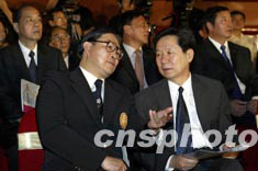 出席儀式的香港嘉賓霍震霆與國務(wù)院港澳辦副主任陳佐耳一起交談。