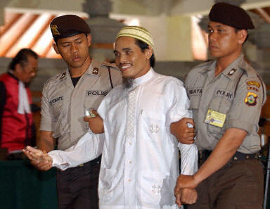 印度尼西亞一家法庭8月7日宣布一名伊斯蘭武裝分子阿姆奧茲(中)在巴厘島爆炸案中犯下的恐怖罪罪名成立,并判決他死刑。去年10月12日,印尼旅游勝地巴厘島一家夜總會(huì)發(fā)生爆炸,造成200多人死亡,330多人受傷,其中多數(shù)為外國游客。