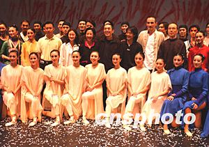 中國(guó)中央芭蕾舞團(tuán)的新版《大紅燈籠高高掛》,八月八日在北京首演成功,導(dǎo)演張藝謀和創(chuàng)作演出人員高興合影。中新社記者:賈國(guó)榮