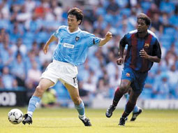 這是曼城備戰(zhàn)新賽季英超的最后一場(chǎng)比賽,同時(shí)也是曼徹斯特大球場(chǎng)的揭幕戰(zhàn),因此,主教練基岡格外重視。孫繼海首發(fā)出場(chǎng)擔(dān)任右后衛(wèi),他的身后是門(mén)將西曼。而他面對(duì)的是剛剛轉(zhuǎn)會(huì)巴塞羅那隊(duì)的小羅納爾多的進(jìn)攻。第5分鐘,奧維馬斯帶球突破菲利普斯后獲得很好的機(jī)會(huì),孫繼海上前封堵,逼得奧維馬斯傳球出界。雖然對(duì)手實(shí)力很強(qiáng),但在主場(chǎng)作戰(zhàn)的曼城仍與對(duì)手展開(kāi)對(duì)攻。孫繼海與菲利普斯這邊的進(jìn)攻明顯要比左路活躍。第34分鐘曼城首先打破僵局,貝爾科維奇中路得球后轉(zhuǎn)身快速突破,雷茨格爾慌亂中將球誤傳給阿內(nèi)爾卡,法國(guó)人門(mén)前右腳推射破門(mén)。上半場(chǎng)曼城一球領(lǐng)先巴塞羅那。