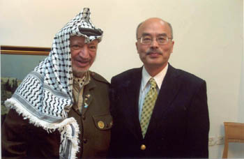 阮:我們?nèi)ツ?月21號(hào)我曾經(jīng)到耶路撒冷,當(dāng)初跟他約了9月22號(hào)下午,我記得很清楚是四點(diǎn)半,我們?nèi)ブ凹s好的。我們飛機(jī)一降落耶路撒冷機(jī)場(chǎng)就聽到新聞,他的官邸已經(jīng)被以軍包圍,不但包圍還轟擊,所以我們等了好幾天,又試圖闖關(guān),不知道他住的地方,巴勒斯坦拉馬拉市到底是什么一種狀況。我們只能從電視看,所以我們?cè)?jīng)試圖四處闖關(guān)都沒有成功,我們就倉(cāng)然而回了。到了今年5月,我們?cè)俣雀佑|,他也同意,因?yàn)樗麑?duì)我們鳳凰一直是十分友好的。他也同意讓我們?cè)偃ィY(jié)果我們要?jiǎng)由淼臅r(shí)候發(fā)現(xiàn)以色列…,因?yàn)榈桨屠账固箾]有別的路走,只有陸路,約旦,安曼那個(gè)地方,陸路要走五六個(gè)小時(shí)。另外一個(gè)是從空中進(jìn)去,但要經(jīng)過以色列的同意,因?yàn)橐?jīng)過特拉維夫的機(jī)場(chǎng),可是特拉維夫機(jī)場(chǎng)對(duì)香港去的,SARS疫區(qū)的人要檢疫兩到三天。換句話說要住進(jìn)醫(yī)院里去,我們那個(gè)時(shí)候也不能到醫(yī)院去住嘛,所以那次又推延了。