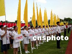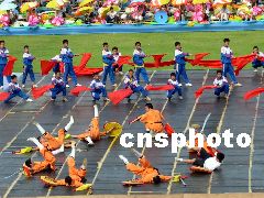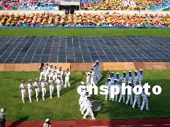2003年8月10日下午5時,以《青春放飛新世紀(jì)》為主題的廣東省第六屆大學(xué)生運(yùn)動會開幕式在湛江師范學(xué)院體育場進(jìn)行第二次預(yù)演,規(guī)?涨埃始姵。熱烈、奔放、高昂、大氣的格調(diào)令人耳目一新。李滿青 攝