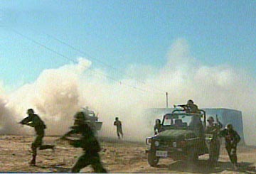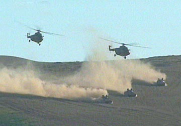 在攻打恐怖分子營地、圍殲恐怖分子的實兵實彈演習(xí)中,參演的聯(lián)合部隊800多人對邊境地區(qū)的恐怖分子營地展開了強大的攻勢。空中直升機盤旋攻擊,地面坦克、裝甲車和步兵從左、中、右三路對恐怖分子實施圍剿,遠方炮兵強大的火力摧毀恐怖分子營地內(nèi)的堡壘,壓制著恐怖分子的火力,不時有導(dǎo)彈呼嘯而過,準確地擊中恐怖分子的指揮地點。特種反恐分隊在模擬國境線上空降,截斷恐怖分子的越境逃逸之路。