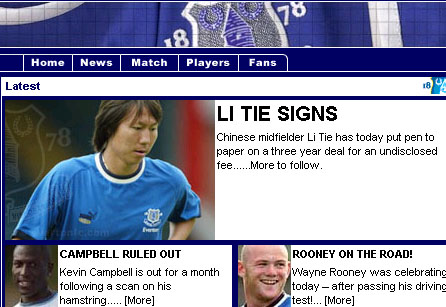 李鐵今天下午在英國簽約后,埃弗頓俱樂部就在第一時間里迫不及待的在其官方網(wǎng)站上向球迷通報了這一喜訊。報道稱,李鐵終于與埃弗頓簽約,并將為球隊效力到2006年。
