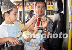 香港巴士司機(jī)黎穆華,8月13日與小朋友一起玩魔術(shù),一家巴士公司在巴士上推出特別節(jié)目,讓乘客輕松學(xué)習(xí)玩魔術(shù)。作者:張慧愉