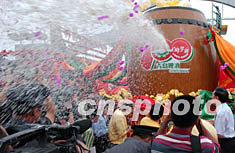 八月十五日,中國(guó)著名啤酒企業(yè)“青島啤酒”迎來(lái)百年華誕。青島啤酒新百年第一桶啤酒十五日上午正式開(kāi)啟。中新社記者:張煒