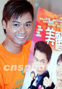 香港無(wú)線(xiàn)電視小生郭晉安向觀(guān)眾贈(zèng)送劇目海報(bào)。