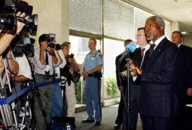 由于聯(lián)合國駐伊拉克辦事處19日遭汽車炸彈襲擊,安南決定立即中止在芬蘭的休假返回聯(lián)合國總部。他在斯德哥爾摩作短暫停留時舉行的記者招待會上說,無論是對聯(lián)合國,還是對伊拉克或整個國際社會,這都是一個“黑色的星期二”,“但我們將繼續(xù)我們的工作,至少我們有責(zé)任不能讓在炸彈襲擊事件中死亡的人白白地犧牲”。