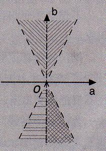 在圖A、B和D中,凡邊界均以虛線示之,凡不連通的區(qū)域均以不同斜率的陰影線區(qū)別之。然而,在標(biāo)準(zhǔn)答案圖C中的b軸用實(shí)線表示,并且b軸兩側(cè)與b軸相鄰的角形區(qū)域用同一斜率的連貫陰影線表示為單一的連通區(qū)域,所以b軸明確地不是邊界。這樣就使“不包括邊界”這個(gè)附注不能對(duì)b軸發(fā)生作用。圖C中只有兩根邊界(虛線表示),所以圖像M表示了不等式F(|b|>|2a|),而不表示不等式E(|b|>|2a|,且a≠0)。所以標(biāo)準(zhǔn)答案圖C是錯(cuò)誤的。四個(gè)選項(xiàng)中沒(méi)有一個(gè)正確,這與提示中所說(shuō)“在每小題給出的四個(gè)選項(xiàng)中,只有一項(xiàng)是符合題目要求的”相矛盾,從而該題是錯(cuò)題!而正確答案應(yīng)為圖二。