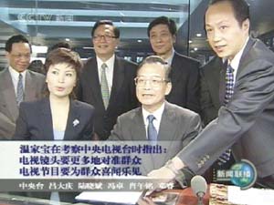 據(jù)央視國(guó)際報(bào)道,溫家寶今天下午考察了中央電視臺(tái),并與中央電視臺(tái)部分干部、記者、播音員、主持人進(jìn)行座談。溫家寶先后來(lái)到中央電視臺(tái)播控中心播控區(qū)、新聞中心演播區(qū),觀看了部分播控設(shè)施、演播室、演播廳等,還觀看了中央電視臺(tái)新臺(tái)址模型。會(huì)見了中央電視臺(tái)部分工作人員。隨后,溫家寶與中央電視臺(tái)一部分干部、記者、播音員、主持人座談。在座談會(huì)上,溫家寶要求每個(gè)發(fā)言人結(jié)合自己的具體工作,提出一個(gè)建議,或者反映一個(gè)問題,或者談對(duì)一件事的體會(huì)。大家發(fā)言踴躍,氣氛十分熱烈。