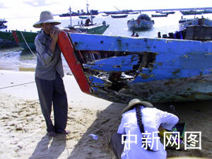 中新社?诎嗽露针(記者關(guān)向東王辛莉通訊員余茂生)海口新海村漁民陳家位,一臉疲憊地依在剛打撈出水的自家漁船船頭,船頭左側(cè)一大洞,后艙甲板翻倒在沙灘上,兩年前花七萬元人民幣造的漁船因一場(chǎng)臺(tái)風(fēng)轉(zhuǎn)眼間散架成一堆廢木。