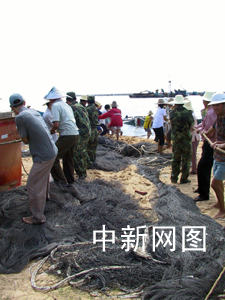 記者在現(xiàn)場(chǎng)看到:海南省海事局派出打撈船在緊張作業(yè),來自駐地的海軍潛水員忙著幫漁民將纜繩系上水底的漁船,而秀英區(qū)武裝部的戰(zhàn)士與當(dāng)?shù)氐母刹、村民一道拉纜,將剛剛出水的船只拖上岸。
