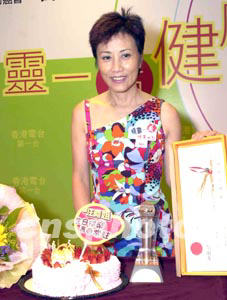 影視紅星汪明荃8月26日出席香港電臺節(jié)目“精靈一點(diǎn)‧健康一點(diǎn)”記者會,曾患癌癥的汪明荃將擔(dān)任節(jié)目主持,將向聽眾提供癌癥的信息。圖為汪明荃快將生日獲港臺送上生日蛋糕、鮮花等禮品。作者:鄧慶樂