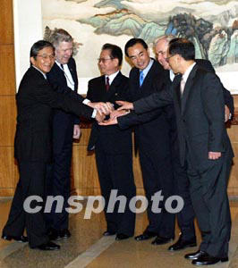 亮相之后,出現(xiàn)了一個(gè)很感染人的場(chǎng)面,朝鮮代表團(tuán)團(tuán)長(zhǎng)、朝鮮外務(wù)省副相金永日的雙手與其他五國(guó)代表團(tuán)團(tuán)長(zhǎng)的手緊緊握在一起,微笑的金永日在這些人里面尤為顯眼。這樣的場(chǎng)景給予了關(guān)注六方會(huì)談的人們和平解決朝核問題的期望。