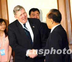 李肇星外長(zhǎng)與韓、日、朝、俄、美代表團(tuán)團(tuán)長(zhǎng)及大使等一一握手、寒暄,大家很配合地?cái)[出好的角度,讓少數(shù)獲得特許進(jìn)來(lái)采訪的記者們拍照。