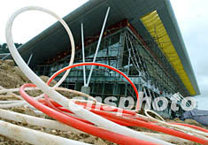 正在四川省松潘縣川主寺修建安裝的九寨黃龍旅游機(jī)場(chǎng)候機(jī)樓,為中國(guó)高原的現(xiàn)代化航空港,將于九月二十八日通航使用。它可?课寮茱w機(jī),滿足年六十萬(wàn)人次的旅客流量。中新社記者:賈國(guó)榮