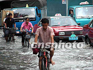 “杜鵑”臺風(fēng)給廣州帶來了狂風(fēng)暴雨,不少地方出現(xiàn)水淹現(xiàn)象,三日,廣州外貿(mào)中心正舉辦一個大型展覽,賓客們只好利用臨時拼造的“小舟”進館。作者:梁永強