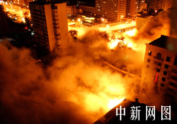 今天凌晨一點(diǎn),隨著指揮員一聲令下“起爆”,好像四五聲沉悶的“雷聲”緊密地接連響起,北京長(zhǎng)安街中華全國(guó)總工會(huì)大樓像觸電一般瞬間在眼前消失,一股巨大的灰黃色的煙霧在爆破處迅速升騰彌漫,在夜空中久久不能消散。
