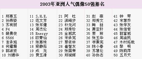 據(jù)聯(lián)合早報(bào)報(bào)道,“2003年亞洲人氣偶像50強(qiáng)”投選范圍包括從事演藝、歌唱、體育、模特兒及服裝界的亞洲人士。經(jīng)過5周熱烈的投票,吸引將近7萬張選票。