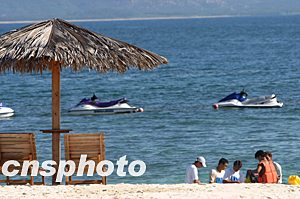 九月十一日,參加2003年新絲路中國模特大賽的眾多佳麗在大賽組委會的安排下,集體到海南三亞風(fēng)景秀麗的吾之洲海灘上參加海上時尚運動。圖為模特馬樂在海灘邊展示優(yōu)美身姿。中新社記者:盛佳鵬