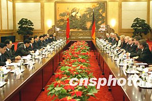 中國(guó)國(guó)家主席胡錦濤十一日在北京人民大會(huì)堂與來(lái)訪的德國(guó)總統(tǒng)約翰內(nèi)斯·勞舉行會(huì)談。中新社記者:毛建軍
