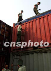 遼寧丹東港邊防檢查站的解放軍九月在丹東市大東港碼頭對(duì)集裝箱進(jìn)行檢查。這個(gè)港口與韓國(guó)和日本貨運(yùn)交往每年大幅遞增,由于偷渡人員采用集裝箱躲藏現(xiàn)象較多,邊防武警十分注重對(duì)集裝箱的檢查。中新社記者:王麗南