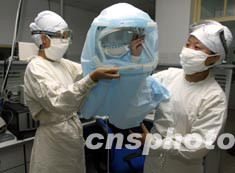根據(jù)北京市新出臺(tái)的防治SARS緊急預(yù)案,如果出現(xiàn)一例SARS患者或疑似患者將首先啟動(dòng)北京市地壇醫(yī)院。9月15日,地壇醫(yī)院ICU的護(hù)士已經(jīng)將治療SARS患者的防護(hù)、治療設(shè)施準(zhǔn)備到位以備隨時(shí)啟用。中新社記者:任晨鳴