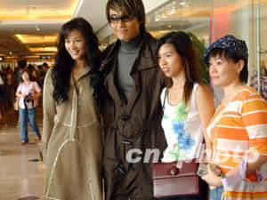 愛情偶像劇《真情告別》主角胡兵和瞿穎首次以“自由行”方式來港,以游客身份在尖沙咀商場(chǎng)購物,圖為游客與二人合影。中新社記者:錢興強(qiáng)
