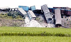 記者看到,脫軌的車廂共有19節(jié)。有兩節(jié)車廂完全橫在了鐵路中央,另幾節(jié)側(cè)翻在鐵路一側(cè),還有兩節(jié)沖下了鐵路路基,多處鐵軌呈彎曲狀,許多車廂的車輪已經(jīng)飛落到周圍的稻田里,路邊的幾根電線桿被連根拔起。列車上集裝箱內(nèi)的瓷磚、大理石等散落一地。據(jù)有關部門認定,脫軌車廂位于列車第27至45節(jié)。南昌鐵路局目前已組織人員在現(xiàn)場進行緊急救援。