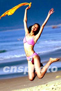 參加第五十三屆世界小姐中國總決賽的選手身著泳裝十八日在三亞亞龍灣進行外景拍攝,飄揚的秀發(fā)顯示出青春活力。中新社記者:毛建軍