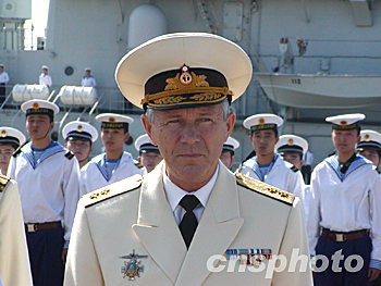 9月20日,俄羅斯海軍“潘捷列耶夫海軍上將”號大型反潛艦,在太平洋艦隊副司令科涅夫·亞歷山大·瓦西里耶維奇中將率領下,抵達青島港,開始對青島進行友好訪問。圖為俄海軍太平洋艦隊副司令瓦西里耶維奇中將在歡迎儀式上。鄒山 攝