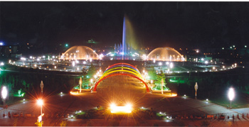 在主入口廣場上的五彩世紀門,宛若彩虹飛至,象征新世紀的曙光。市民廣場以硬質(zhì)景觀為主,便于人們集會、休憩、交往,是真正意義上的城市客廳,在市民廣場上建有大型水旱組合型彩色音樂噴泉,共有28種水形變化。其東西長200米,面積4500余平米,并配有水幕投影系統(tǒng),中央旱噴泉主噴高達80米。東西兩側(cè)水泉對稱布置,為觀賞噴泉。兩側(cè)旱泉為游戲噴泉,以滿足人們的親水愿望,東側(cè)有奧運五環(huán)、時空隧道、歡快跳泉,西側(cè)有戲水踏泉、游戲迷宮,兩側(cè)可同時供200多人參與游戲。音樂噴泉綜合運用現(xiàn)代高科技手段,聲、光、水、電的完美結(jié)合,使噴泉水形豐富、氣勢宏偉、搖曳多姿,隨著音樂翩翩起舞,夜晚在彩色燈光的照耀下,更顯得魂麗多彩,聲、光、水景把您帶入一個優(yōu)美的藝術(shù)境界。它充分表現(xiàn)了保定一千一百萬人民團結(jié)奮進、蓬勃向上、經(jīng)濟和社會發(fā)展日新月異、繁榮昌盛的壯麗景象。在市民廣場的下面建有地下商城,占地面積3萬平米,為游人購物、餐飲、娛樂、提供了寬敞、便利的空間。