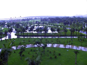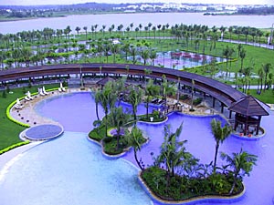 事實(shí)上,當(dāng)記者站在酒店總統(tǒng)套房的大露臺上,心曠神怡的感覺真是撲面而來。在這個露臺上俯瞰酒店的生態(tài)泳池,綠色的島嶼小品與棕色木質(zhì)燒烤回廊講述著回歸自然的故事;視野穿過起伏的高爾夫球場,可以遠(yuǎn)眺南中國海的碧波。一條被河流沖積泥沙與外海海浪共同作用而成的沙堤——玉帶灘,蜿蜒三公里將萬泉河、龍滾河、九曲江三江入?诜殖闪藘(nèi)外咸淡兩海,其中內(nèi)海之中形成若干個小島,在眼前演繹著豐富而多變的江、河、湖、海、島嶼、山脈的水域景觀。