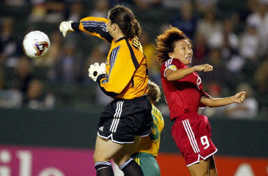 下半場中國隊(duì)進(jìn)行了調(diào)整,并在開賽第一分鐘就利用一次邊路的傳中機(jī)會(huì),由白潔在亂軍中將球射向?qū)Ψ酱箝T。雖然澳大利亞隊(duì)后衛(wèi)將球碰了一下,但并沒有將球擋出。中國隊(duì)扳平了比分。