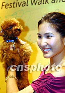 香港藝人原子鏸抱著心愛的小狗,出席在“又一城”舉行的“秋日浪漫展霓裳”時(shí)裝展。作者:洪少葵