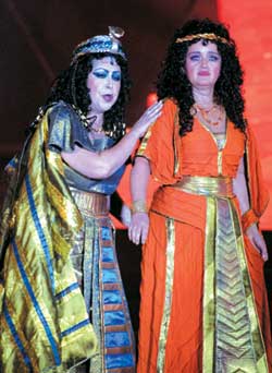 盡管專業(yè)氣象臺一直預(yù)報演出時無雨,但是昨天一天的天氣都十分陰沉,讓人不禁為這場演出捏了一把汗?墒抢咸煊醒郏搅税頃r天氣變得格外的好。當(dāng)晚八時,《阿依達(dá)》在萬眾企盼中終于熱鬧開場。一陣優(yōu)美的前奏之后,美麗的埃塞俄比亞公主阿依達(dá)翩然出場。金字塔在絢麗燈光的映襯下,透著迷人的光暈。冰島男高音歌唱家克里斯蒂安·約翰遜扮演的男主角拉達(dá)梅斯、意大利著名男低音歌唱家佳尤蒂扮演的大祭司等劇中角色依次出場,洪亮的嗓音和優(yōu)美的唱腔不時博得觀眾的陣陣掌聲。