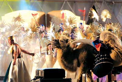 當(dāng)晚演出的高潮出現(xiàn)在第二幕第二場。在雄壯有力的凱旋進(jìn)行曲聲中,兩千名由武警戰(zhàn)士扮演的身穿戰(zhàn)袍的勇士邁著整齊的步伐走過這個世界上最大的舞臺,上千名歡慶勝利的群眾在舞臺上載歌載舞,而繳獲的戰(zhàn)利品——駱駝、老虎、獅子等動物明星們的出場以及在體育場看臺四周齊放的絢麗的煙花更增添了歡慶的節(jié)日氣氛。這時,工人體育場一下子沸騰了,觀眾們被眼前盛大的場景深深感染了,臺上臺下歡呼聲響成一片,首屆北京國際戲劇演出季掀起了第一個高潮。