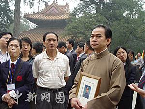 香港曉風學社參禮團的梁崇武先生,手捧父親梁子江先生的遺像參加了祭拜。原來,祖籍香港的梁子江先生,生前對孔子非常崇敬,并在香港創(chuàng)辦了以研究、弘揚祖國書畫、篆刻藝術的“曉風學社”,一直想著要到曲阜孔廟祭拜孔子。后來梁子江先生年齡大了行動不便,最終抱憾而去。今年,梁崇武先生與香港曉風學社的成員邀請了梁子江先生的弟子與生前好友共六十多人前來祭孔。梁崇武先生在大成殿前高舉著父親的遺像說道:“父親,今天我為您實現(xiàn)了遺愿”。